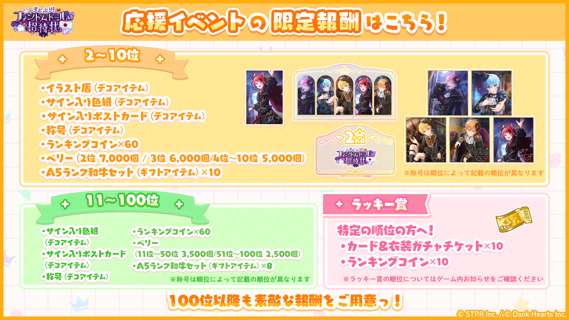応援イベントのランキングの順位に応じて特別な報酬を入手することができます。