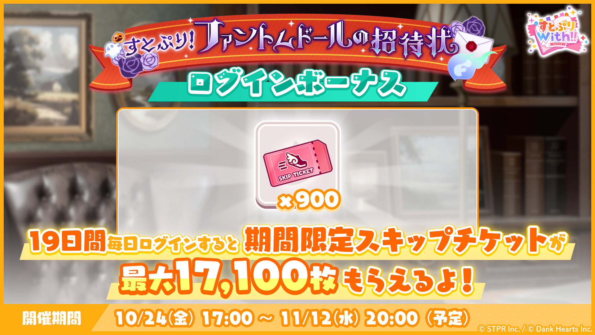 本日10月24日(金)より、「すとぷり!ファントムドールの招待状 応援イベント ログインボーナス」を実施中です。
