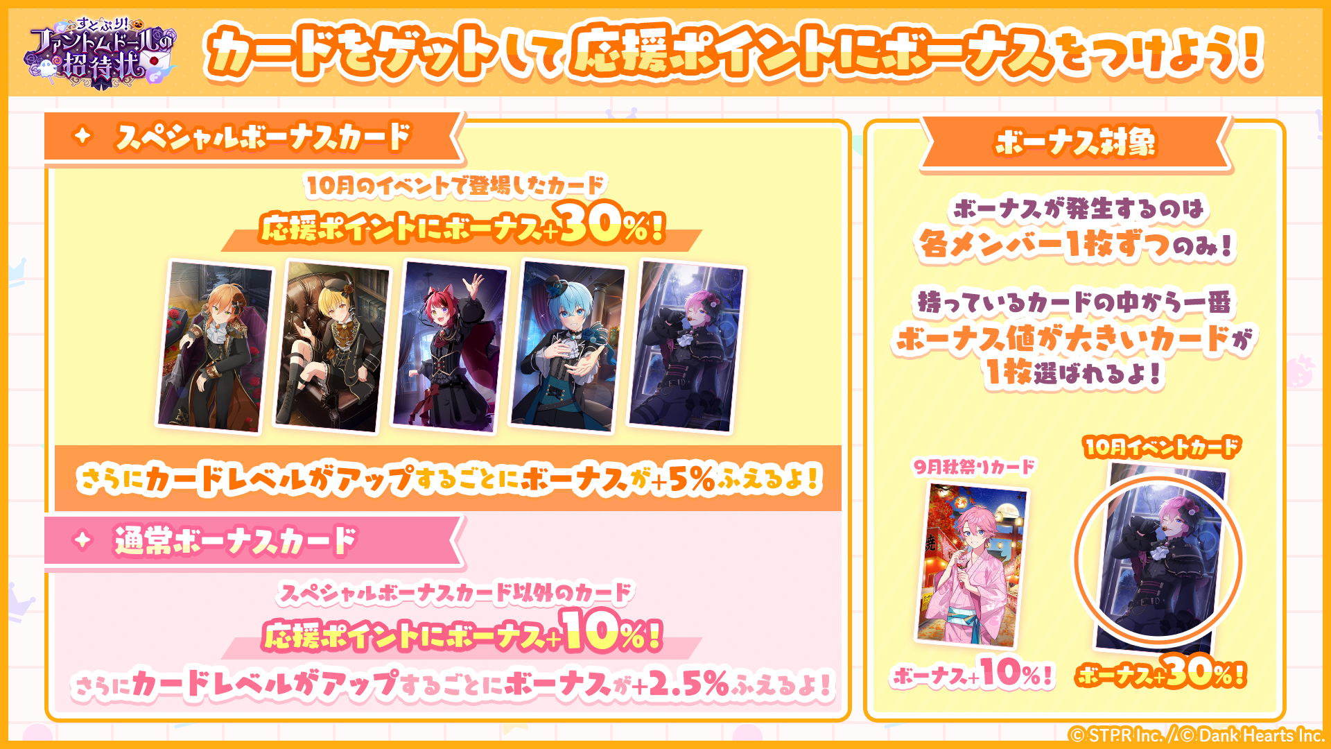 今月のメインストーリー「すとぷり!ファントムドールの招待状」に関連したカードは、「通常ボーナスカード」よりもボーナスが高い「スペシャルボーナスカード」となっています。