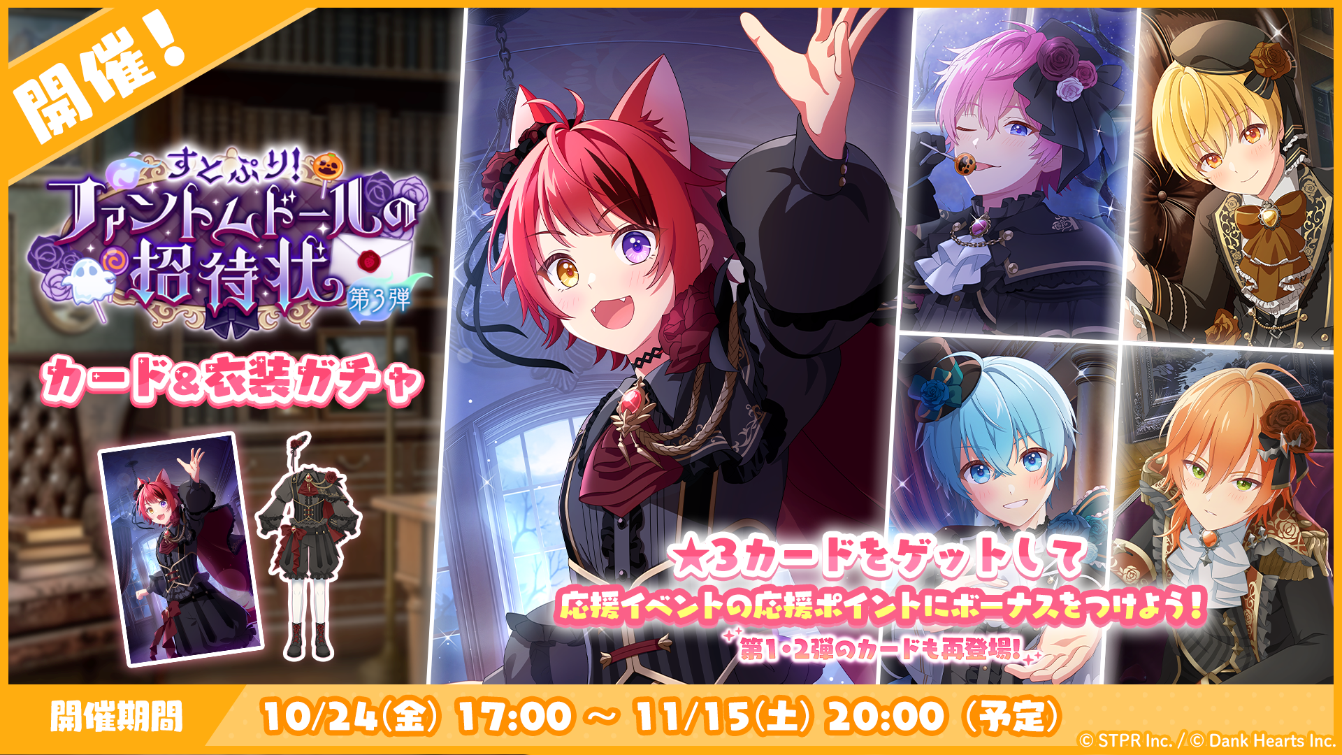 本日10月24日(金)より、新たな★3カードがピックアップ登場する「すとぷり!ファントムドールの招待状 第3弾 カード&衣装ガチャ」が開催中です。