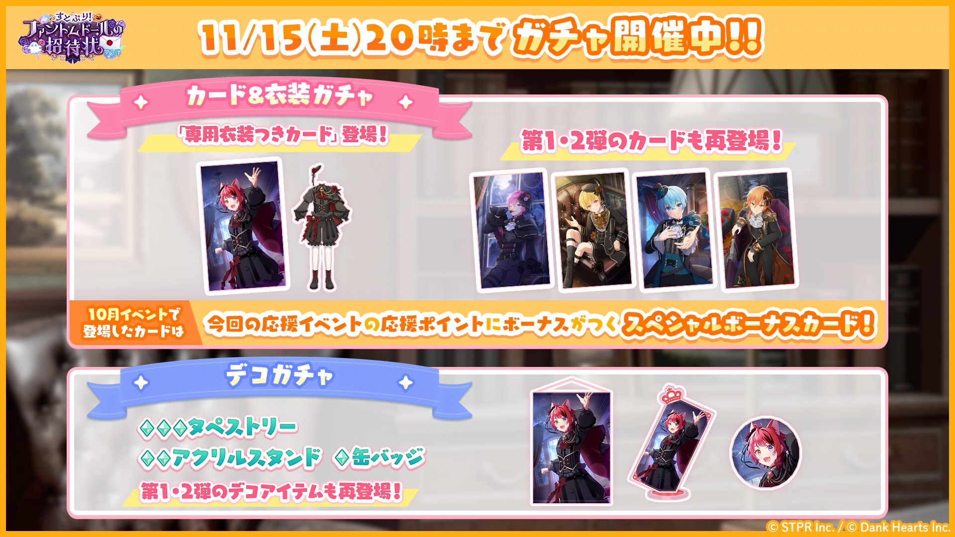 「すとぷり!ファントムドールの招待状 第1弾カード&衣装ガチャ」「すとぷり!ファントムドールの招待状 第2弾 カード&衣装ガチャ」にて登場したカードが再度ピックアップされます。