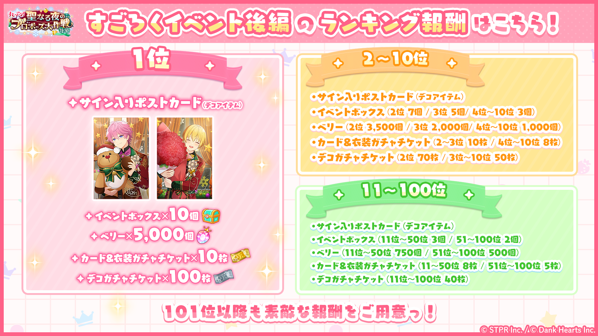ランキング上位者には特別なデコアイテムやベリーなどの報酬が獲得できるイベントになっています。ランキングに参加した方全員にも報酬を用意しています。イベント開催に合わせて、カード&衣装ガチャやデコガチャ、キャンペーンチャレンジなど様々なコンテンツが追加されておりますので、是非ご参加ください。