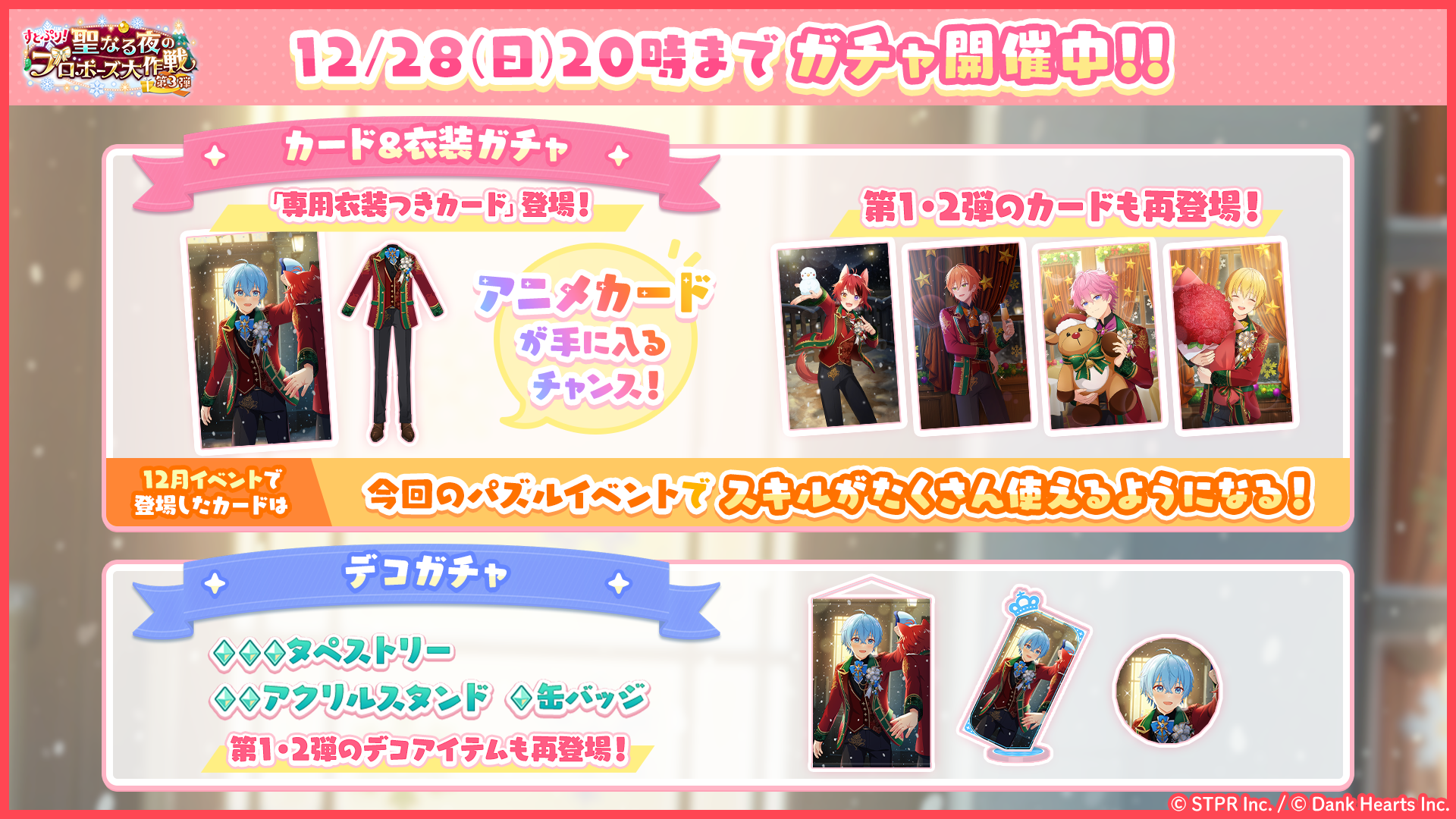 「すとぷり!聖なる夜のプロポーズ大作戦 第1弾カード&衣装ガチャ」「すとぷり!聖なる夜のプロポーズ大作戦 第2弾 カード&衣装ガチャ」にて登場したカードが再度ピックアップされます。