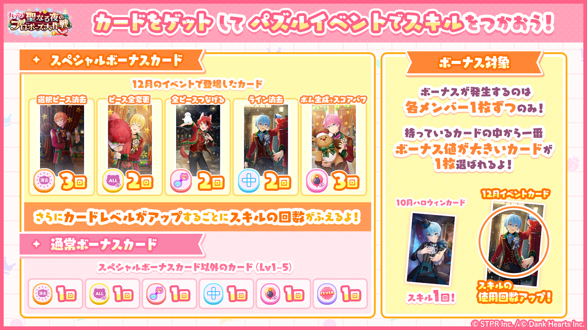 「すとぷり!聖なる夜のプロポーズ大作戦」の「スペシャルボーナスカード」を所持していると、対応する「スキル」の使用回数にボーナスが発生します。