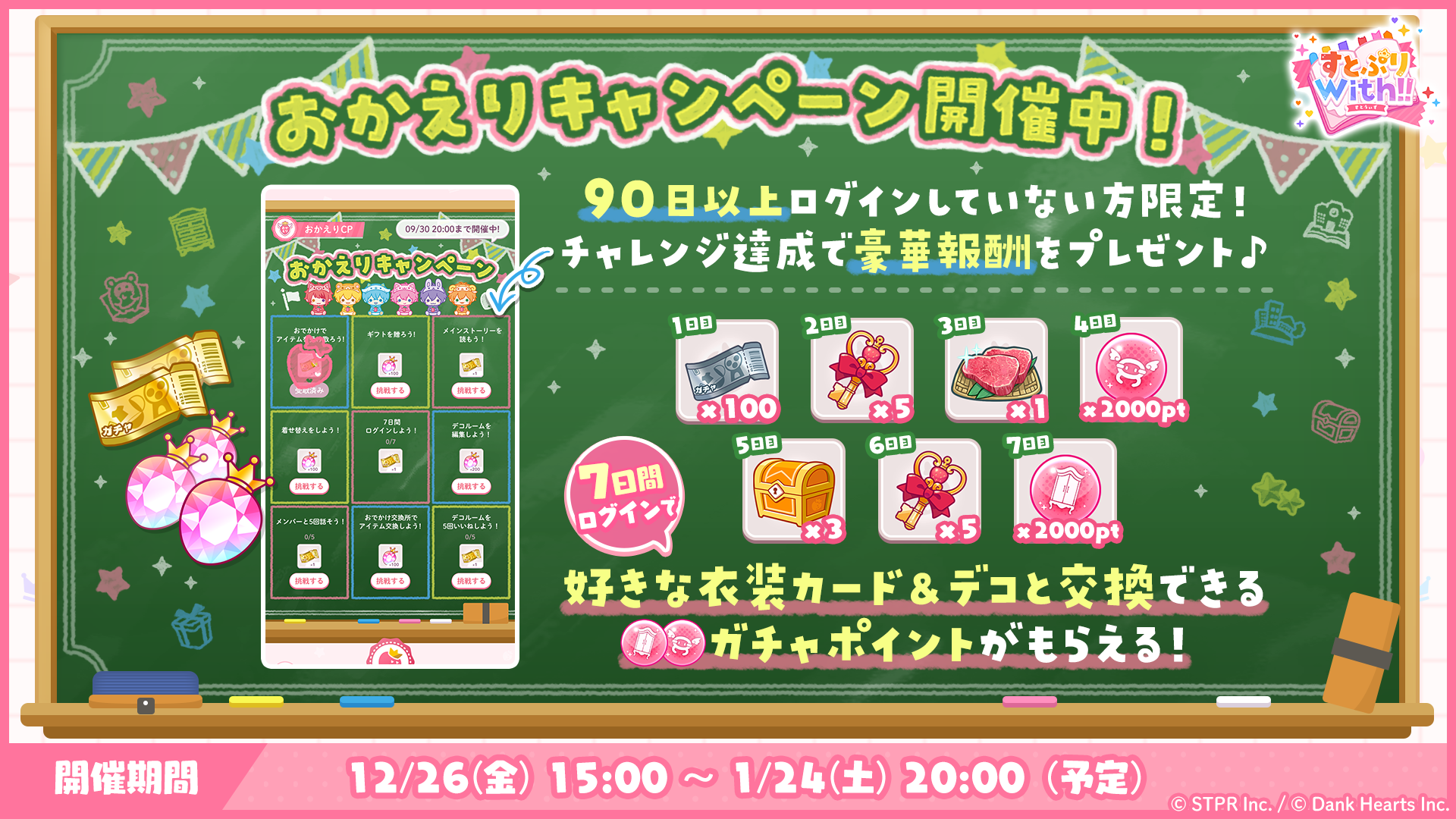 12月26日(金)より、最終ログイン日時から90日間以上ログインをしていない方を対象に「おかえりキャンペーン」が開催中です。