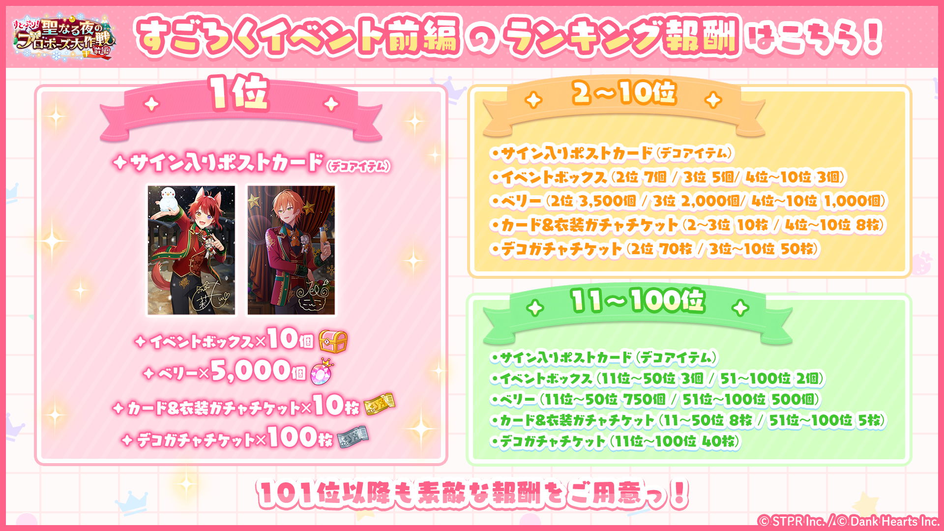 ランキング上位者には特別なデコアイテムやベリーなどの報酬が獲得できるイベントになっています。ランキングに参加した方全員にも報酬を用意しています。イベント開催に合わせて、カード&衣装ガチャやデコガチャ、キャンペーンチャレンジなど様々なコンテンツが追加されておりますので、是非ご参加ください。