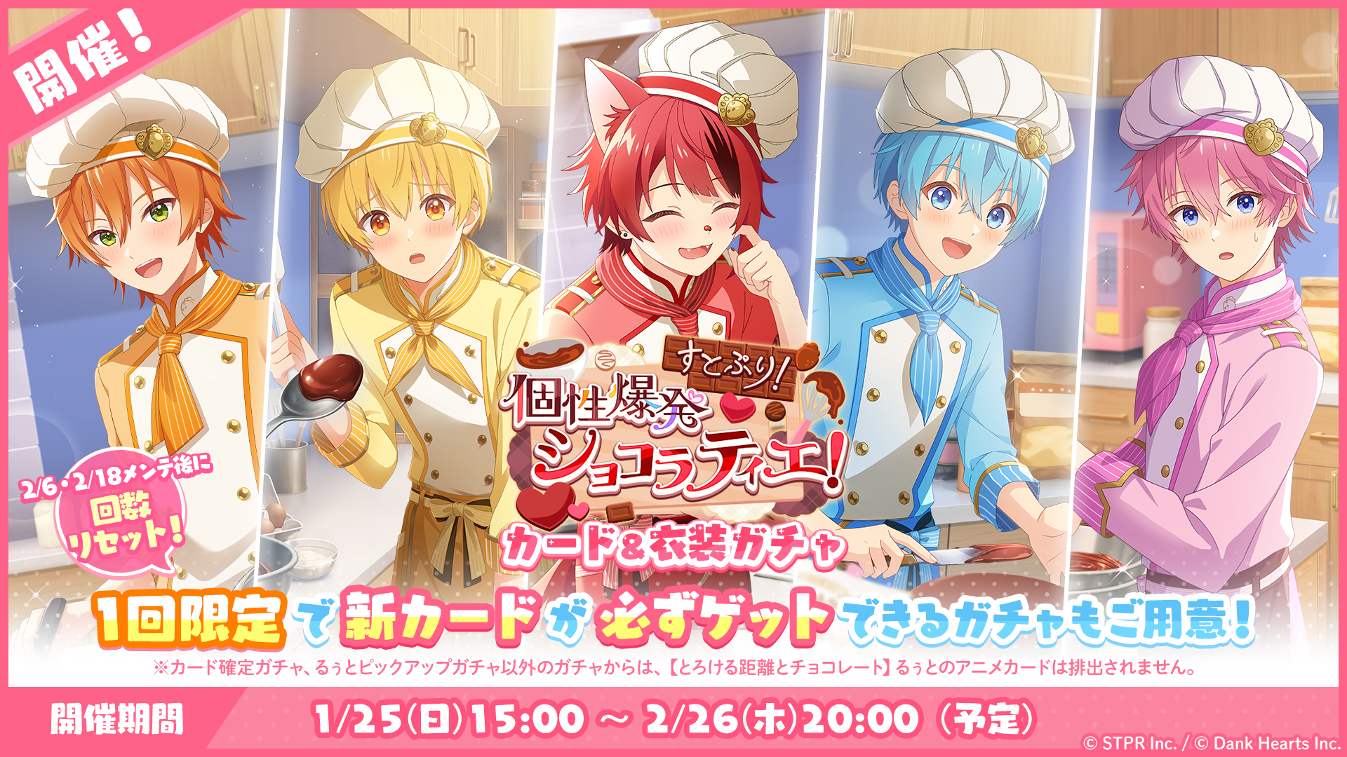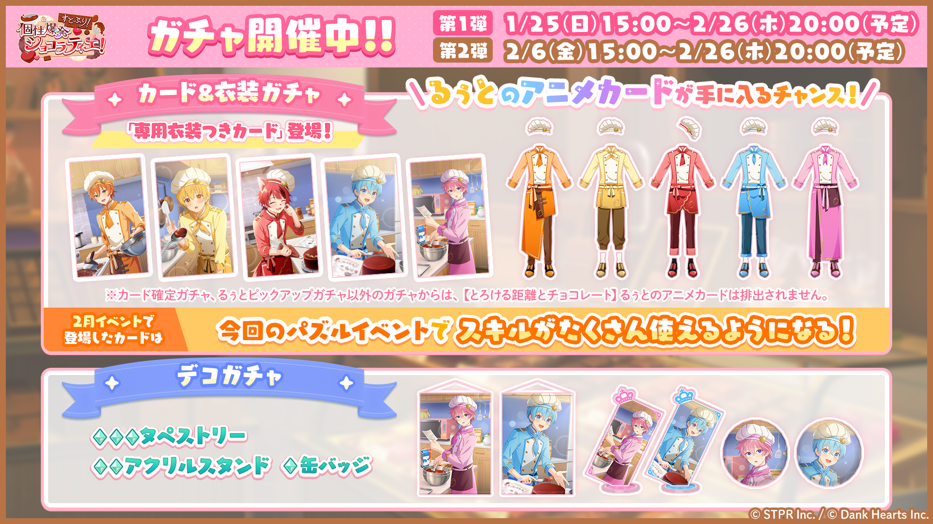 本日1月25日より、各メンバーの新たな★3カードがピックアップ登場する「すとぷり!個性爆発ショコラティエ! カード&衣装ガチャ」が開催中です。