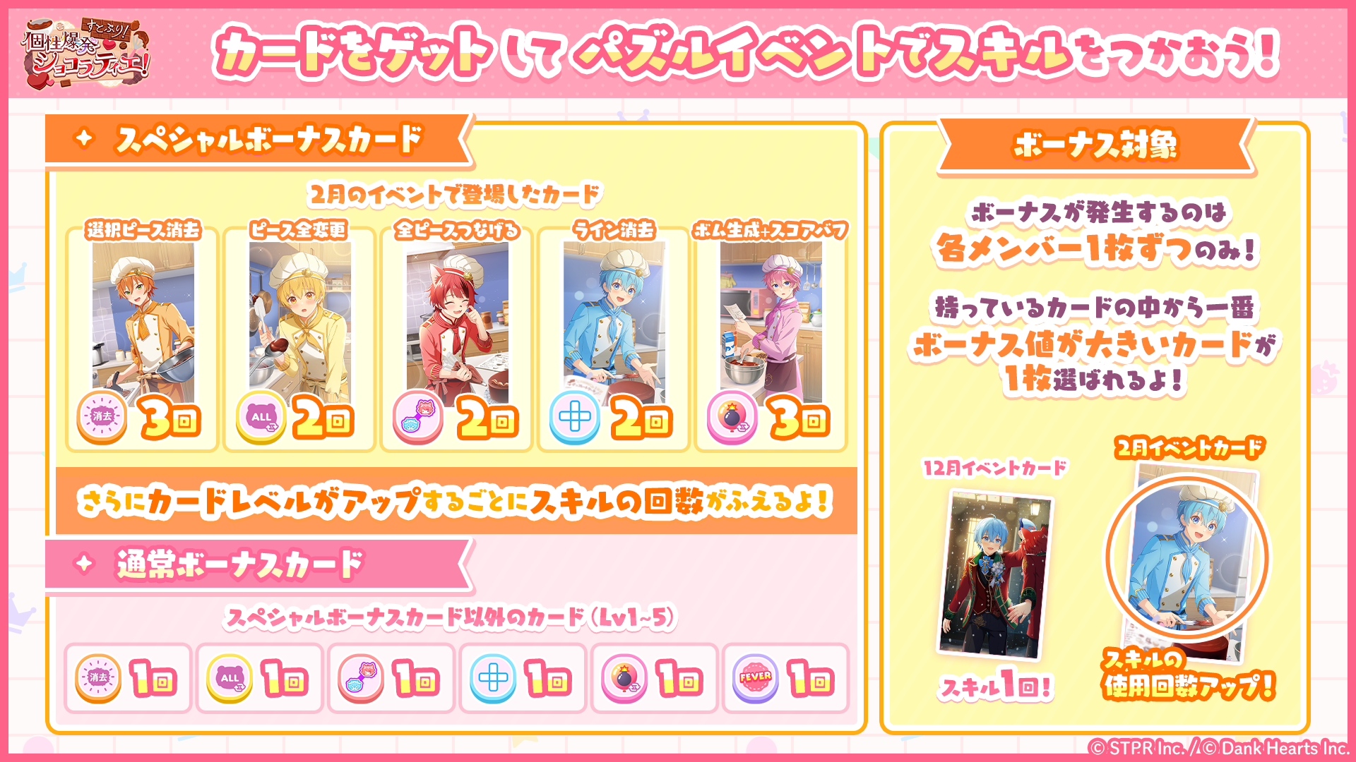 「すとぷり!個性爆発ショコラティエ!」の「スペシャルボーナスカード」を所持していると、対応する「スキル」の使用回数にボーナスが発生します。