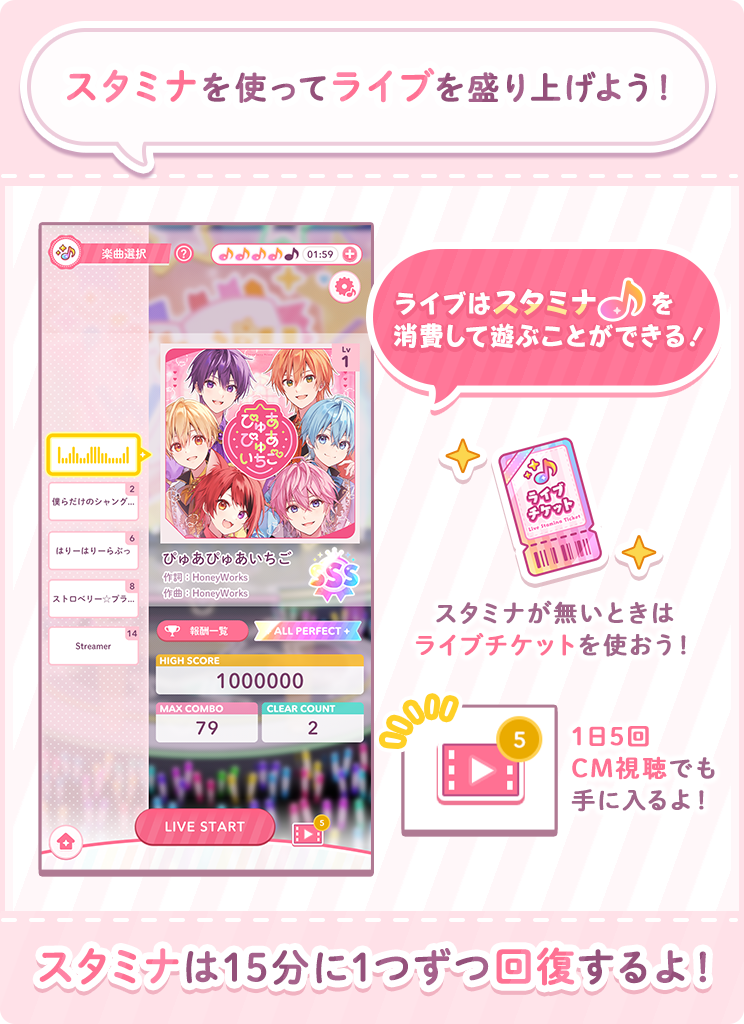 ライブはスタミナを1つ消費し遊ぶ事ができます。