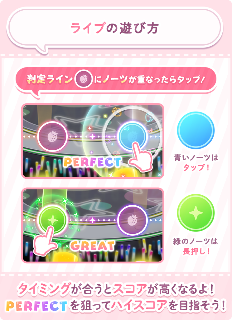 ノーツに合わせて画面をタップすることで、ペンライトを振りライブを楽しむことができます。