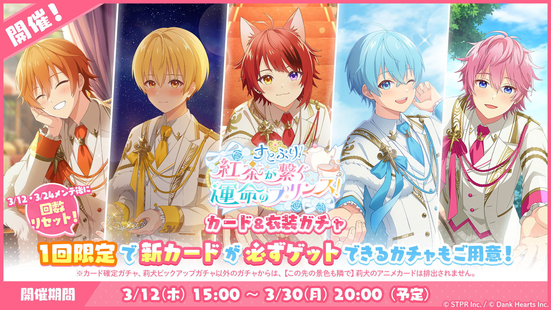 本日より、期間中1回限定で新たな★3カードが必ず獲得できる「カード確定!すとぷり!紅茶が繋ぐ運命のプリンス! 第2弾 カード&衣装ガチャ」が開催中です。