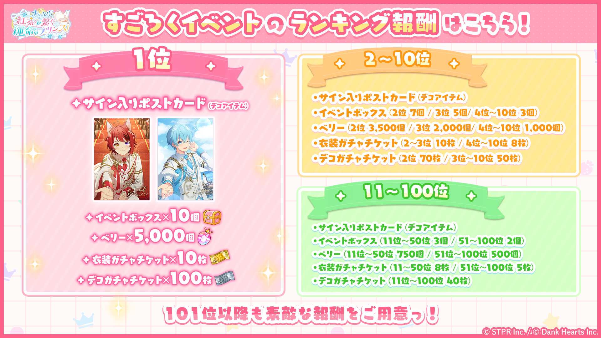 ランキング上位者には特別なデコアイテムやベリーなどの報酬が獲得できるイベントになっています。ランキングに参加した方全員にも報酬を用意しています。イベント開催に合わせて、カード&衣装ガチャやデコガチャ、キャンペーンチャレンジなど様々なコンテンツが追加されておりますので、是非ご参加ください。
