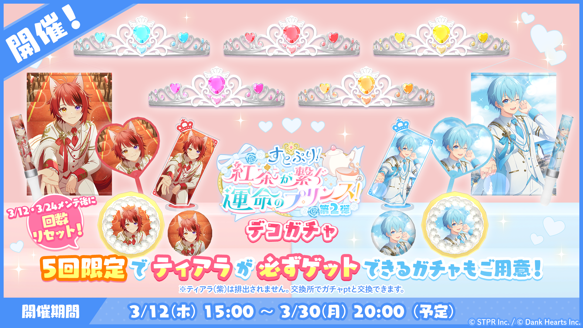 開催期間中は通常のデコガチャに加え、1回限定でティアラが必ずゲットできる「ティアラ確定!紅茶が繋ぐ運命のプリンス! 第2弾 デコガチャ」の開催も予定しております。