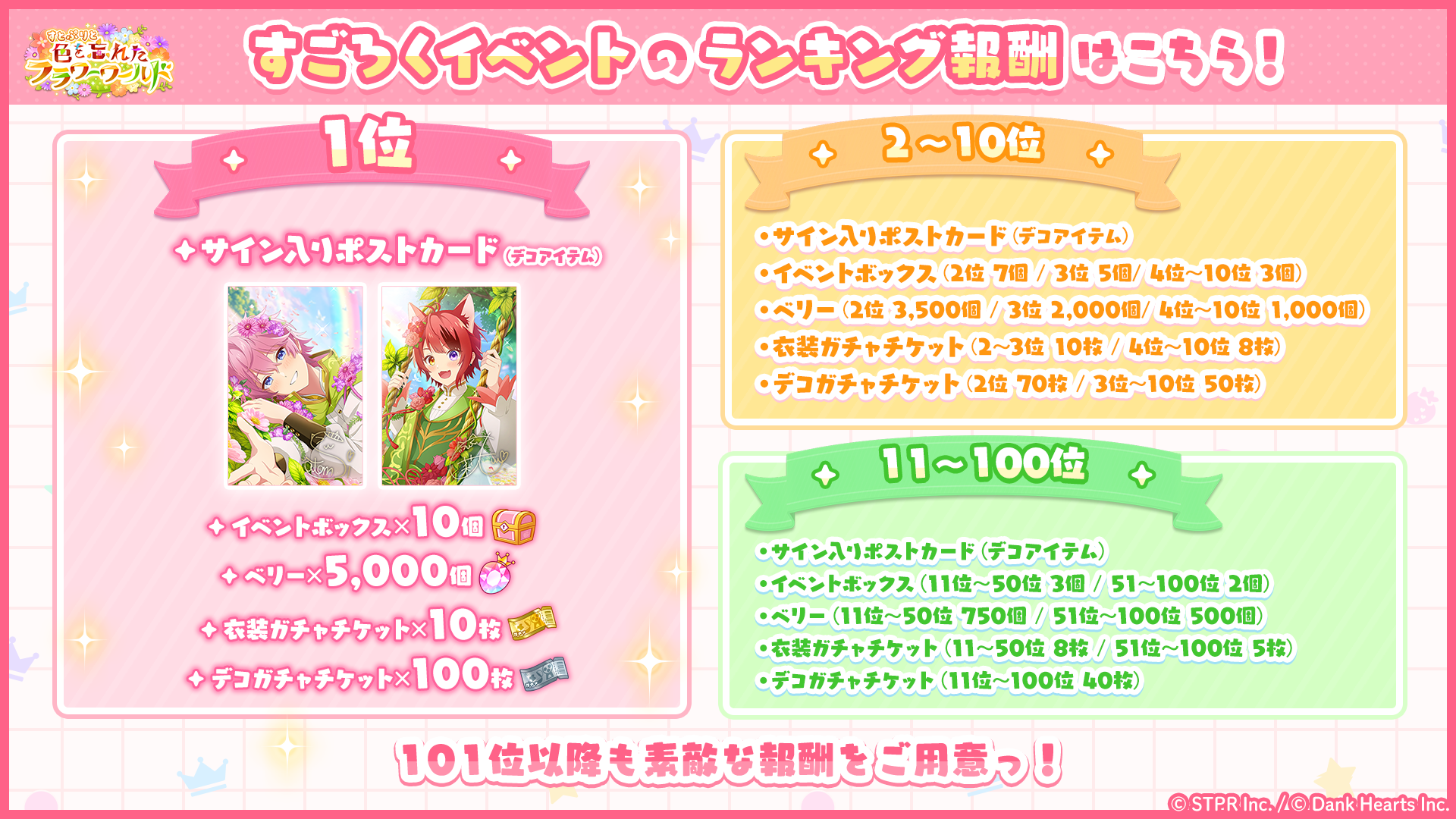 ランキング上位者には特別なデコアイテムやベリーなどの報酬が獲得できるイベントになっています。ランキングに参加した方全員にも報酬を用意しています。イベント開催に合わせて、カード&衣装ガチャやデコガチャ、キャンペーンチャレンジなど様々なコンテンツが追加されておりますので、是非ご参加ください。